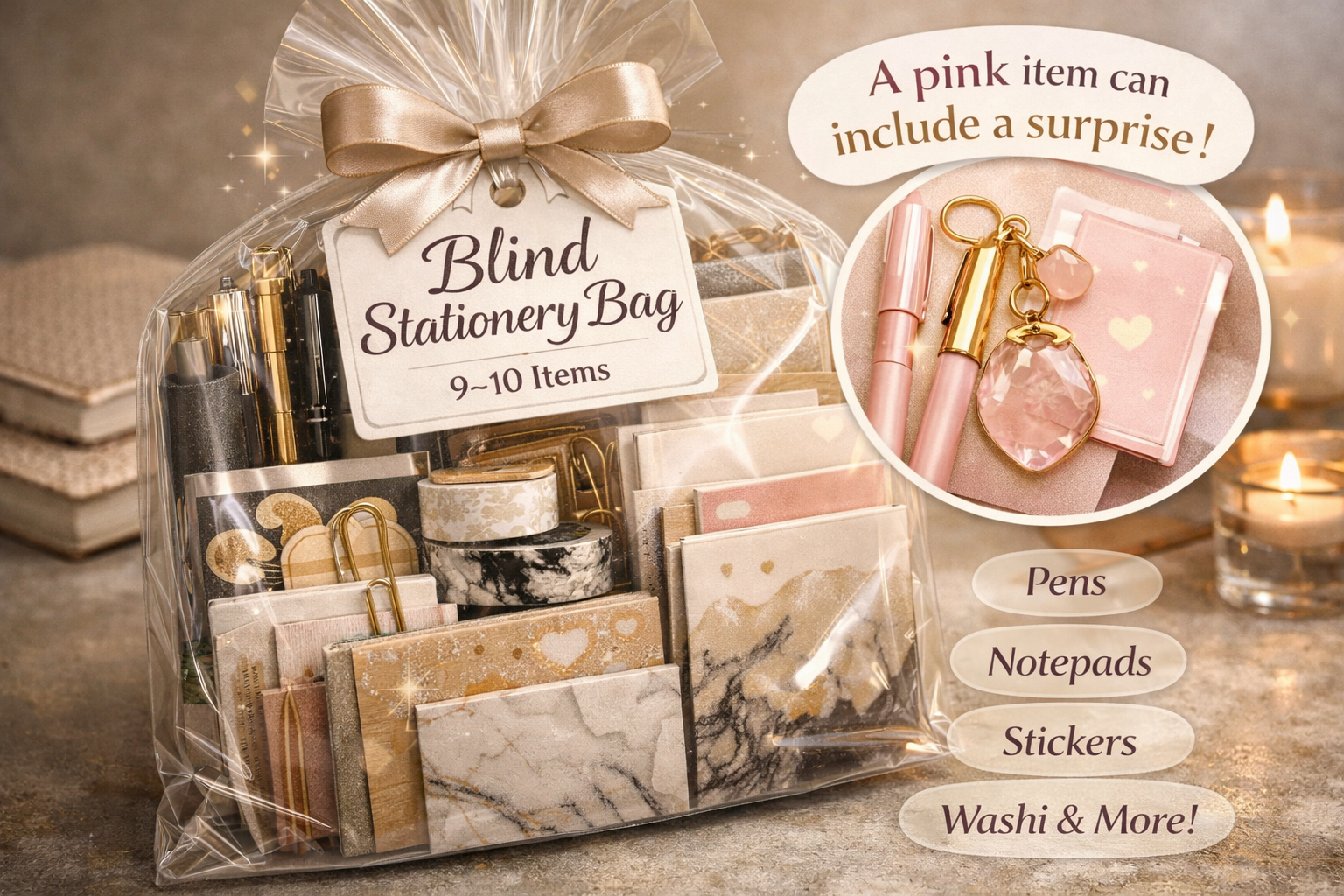 Some bags may include a pink-themed item. If a pink item is included, the bag may also contain a small bonus stationery item as an extra treat.